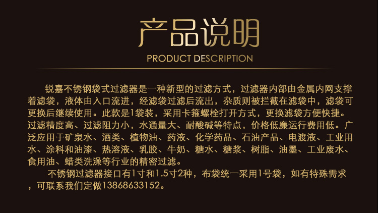 銳嘉不銹鋼袋式過濾器是一種新型的袋式過濾器,可過濾水、柴油、酒精等各種液體,布袋統一采用1號,袋如有特殊需求,可聯系我們定做。